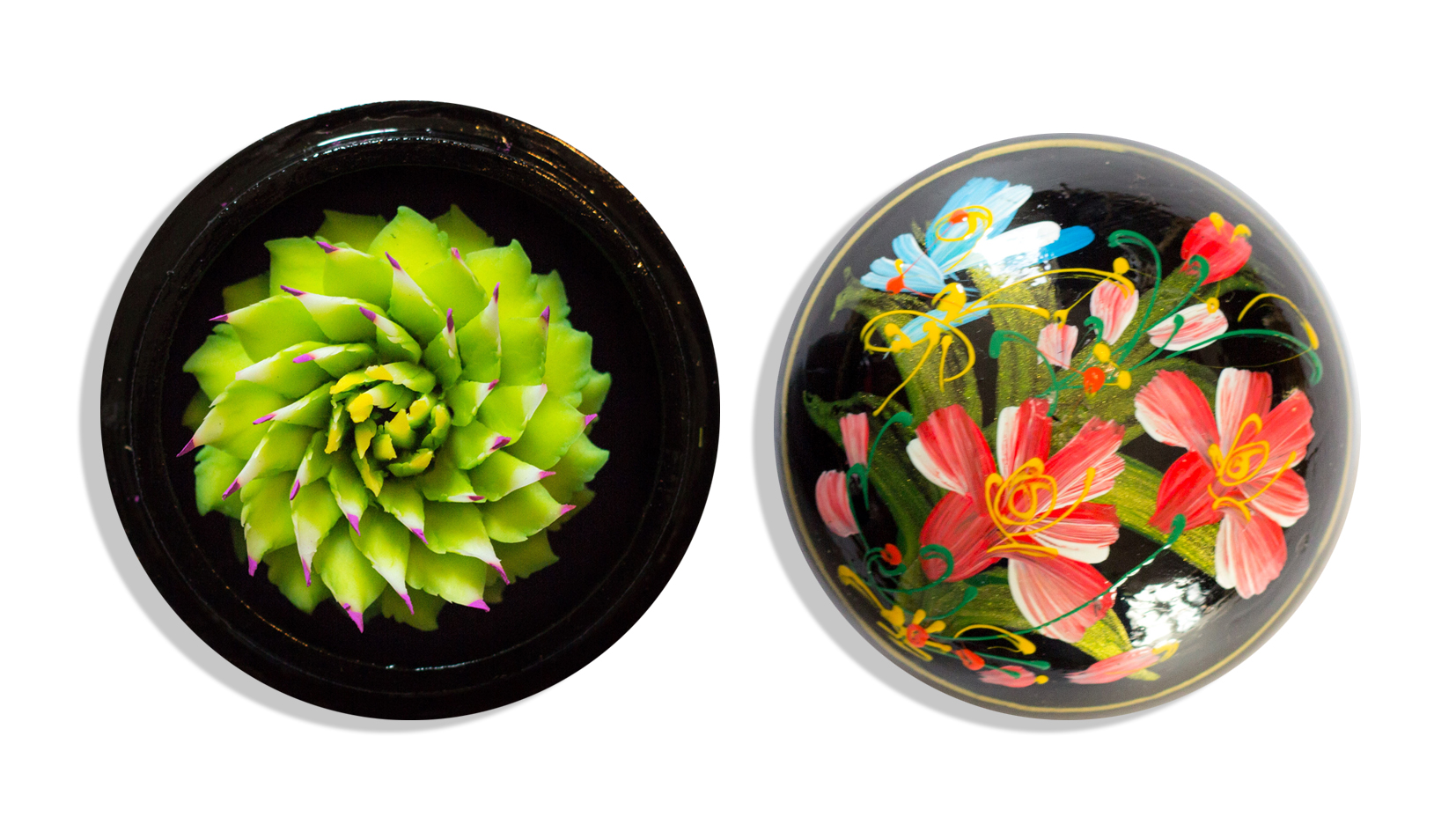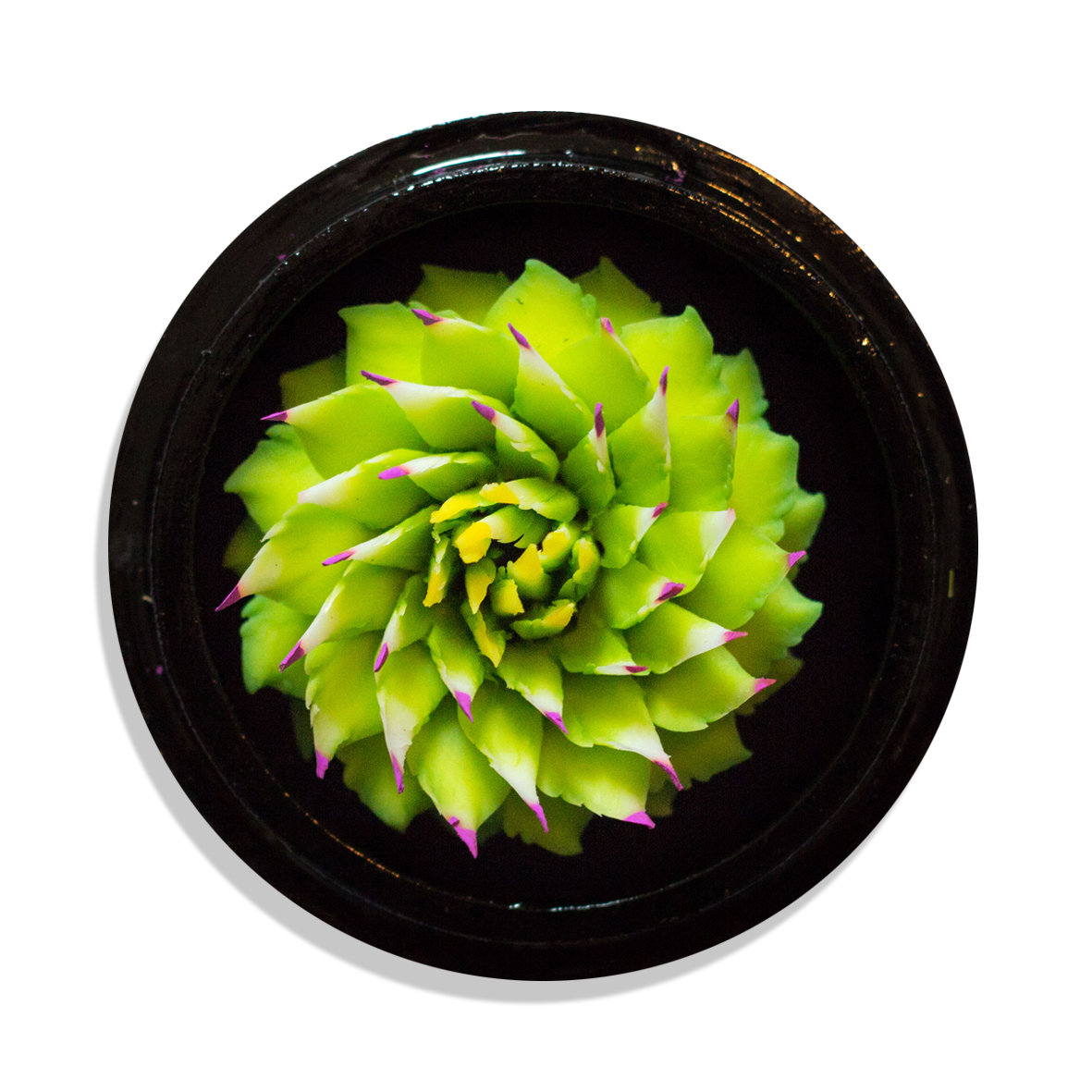 - inspiriert von einer Lotusblüte mit grünen Blättern und weiß-violetten/gelben Spitzen