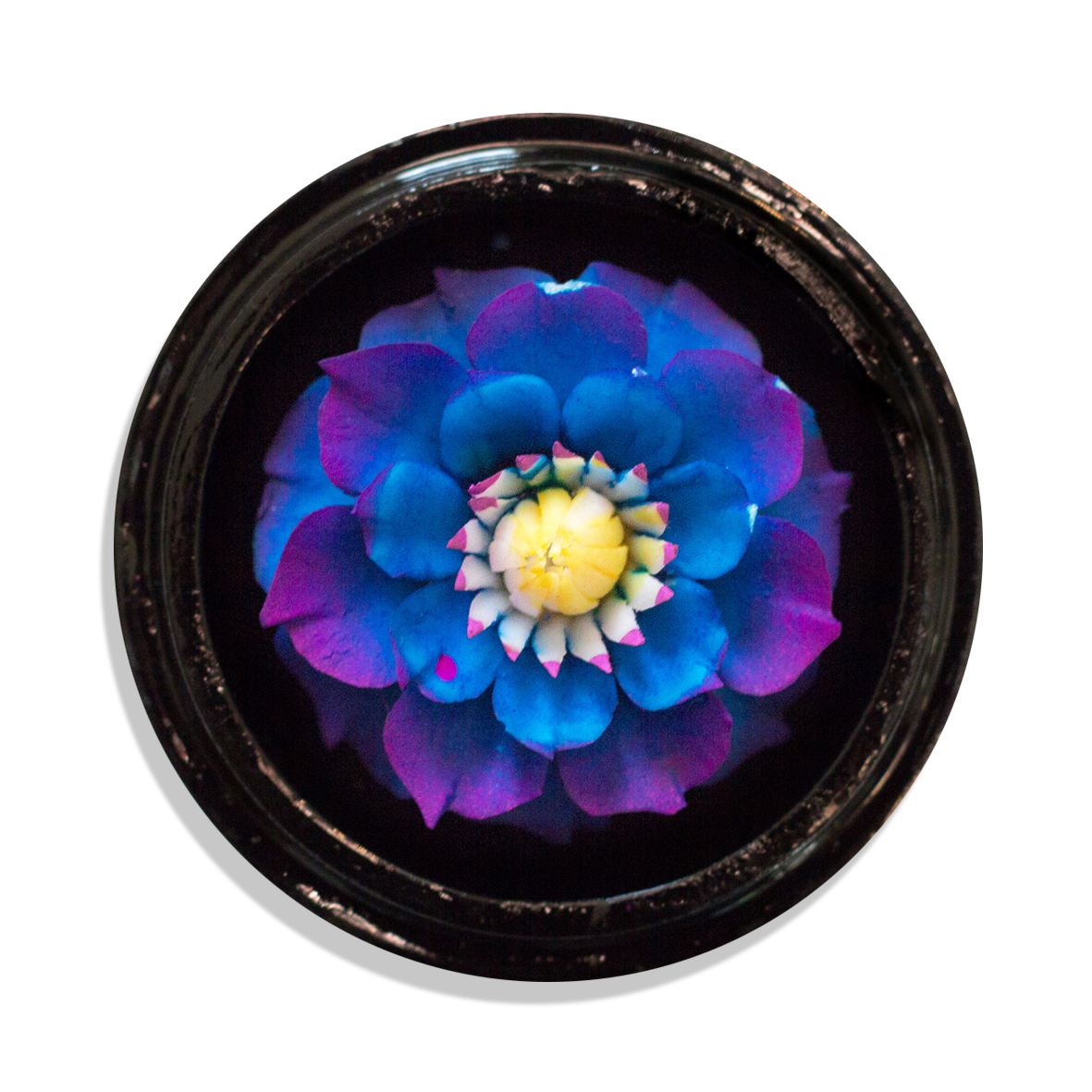 - inspiriert von einer Gladiaole mit violett-blauen Blütenblättern und gelber Knospe
