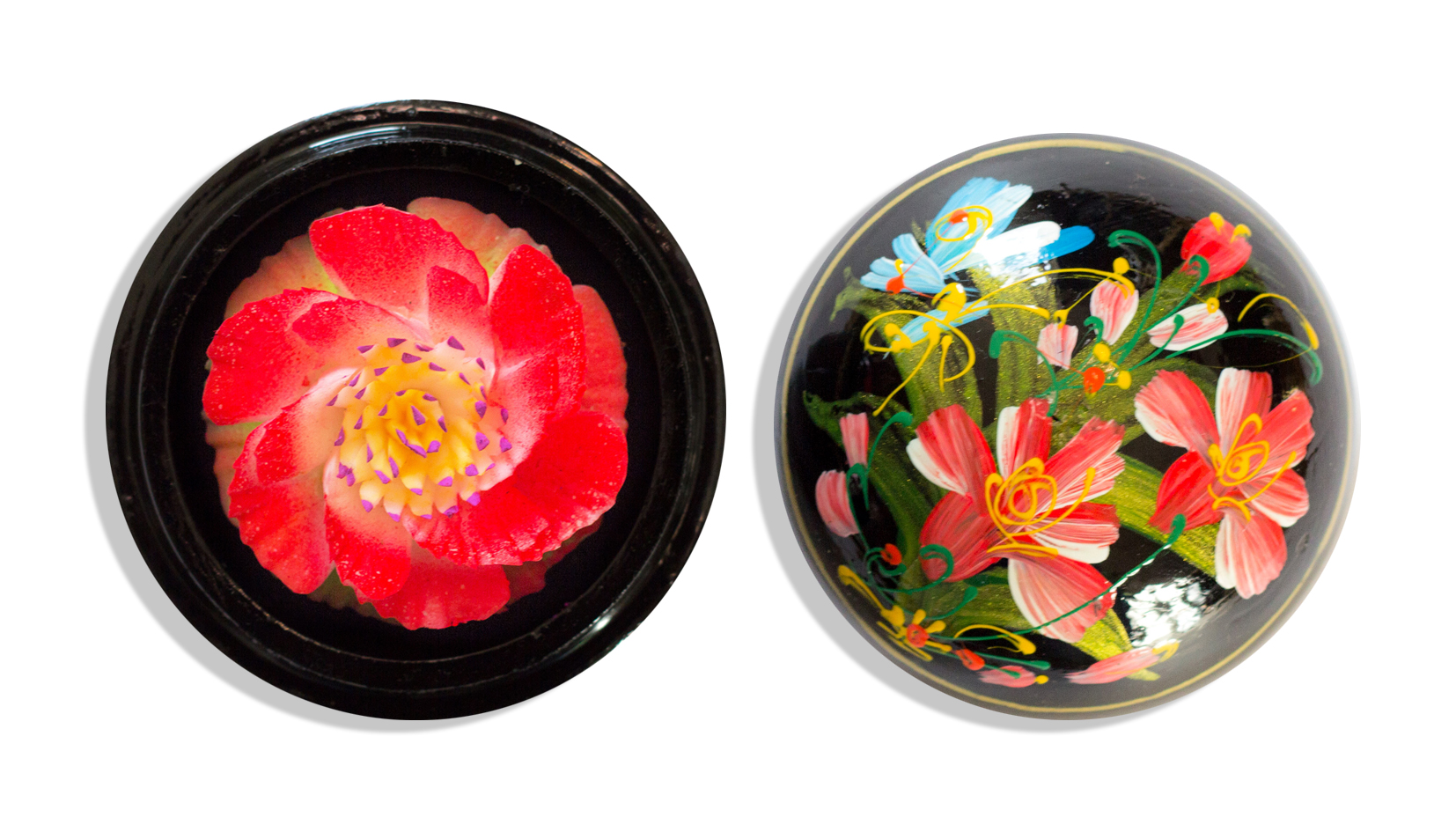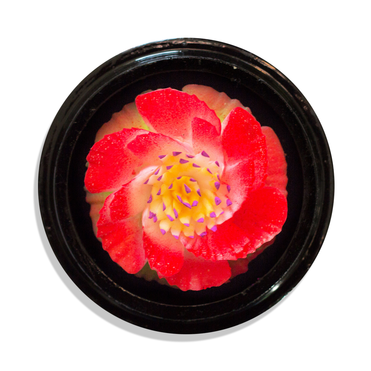 - inspiriert von einer Primula mit rot-weißen Blütenblättern und gelber Knospe